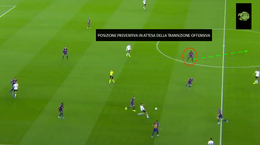 Nella fase di transizione difensiva Ansu Fati cerca di mettersi in posizione preventiva per un eventuale ripartenza immediata e passaggio alla transizione offensiva.